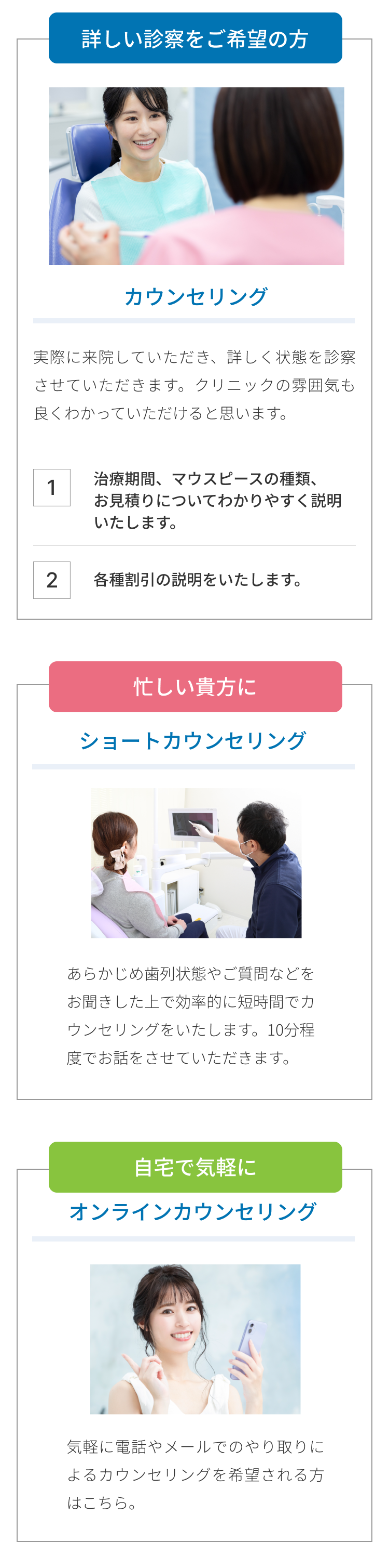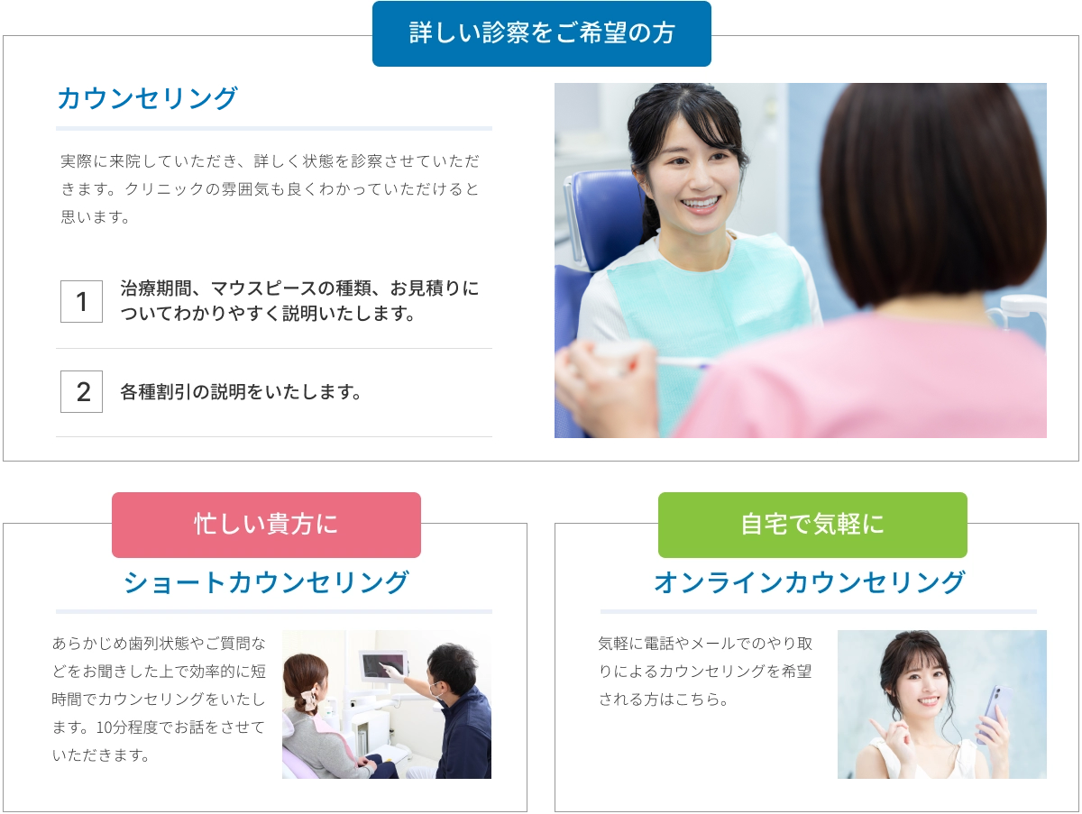 サクラ歯科医院では、矯正治療スタート前の、説明、 カウンセリングをとても大切に考えています。 カウンセリングタイプも、おひとりおひとりのニーズにお応えできるよう、考えました。